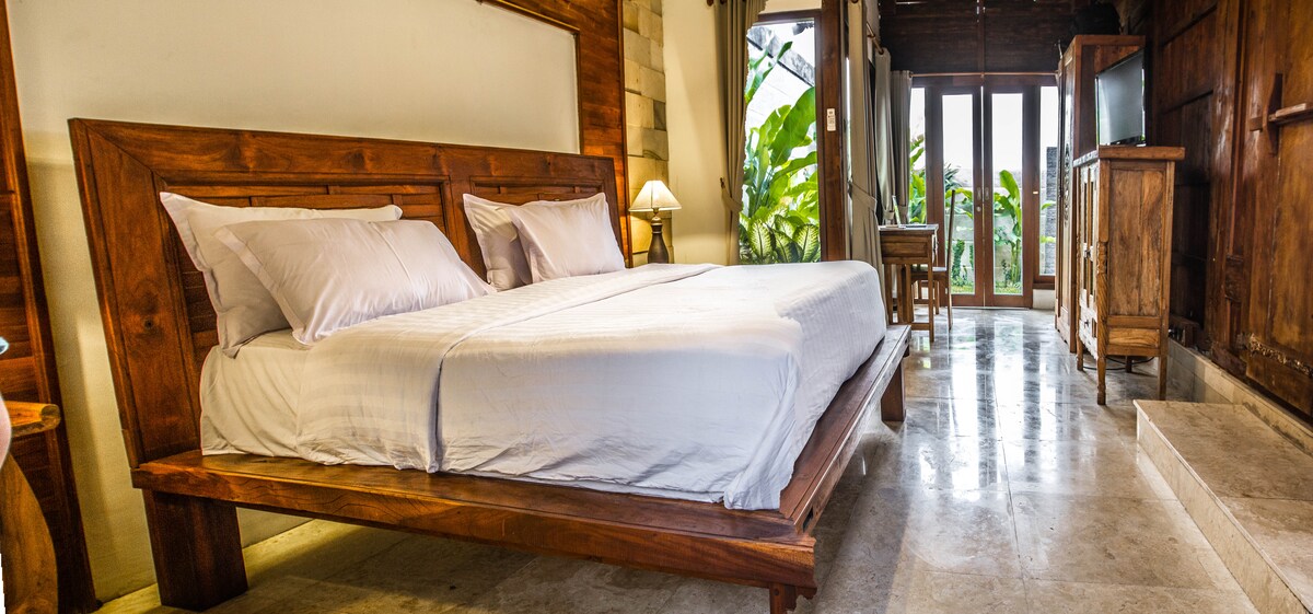 The villa looked exactly like in pictures, very traditional Balinese, lots of carvings on gorgeous teak throughout. There were 3 rooms and all were spacious. The master bedroom had a partial outdoor bathroom with a rain shower.
